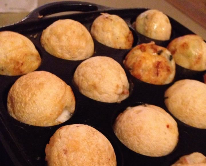 筑波ハムの高級ソーセージ、ベーコンを使いましたので、ジューシーコクがあります。蛸のかわりに、ベーコン、チーズ、青ネギ、揚げ玉、しそ、もち、コーンの組み合わせが大好評でした。
