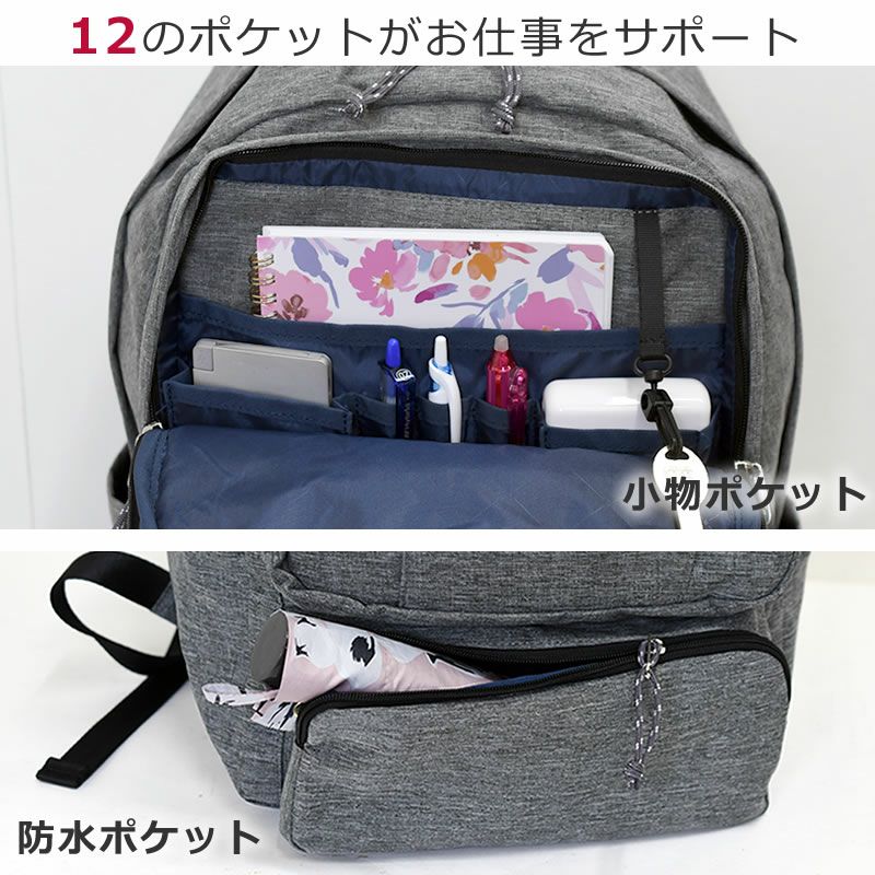 ビジネスリュック レディース テレワーク 7553L の解説会社で支給される15.6インチのノートパソコンが入る大容量のビジネス レディース リュック。テレワークのPCの持ち帰りに丁度いいパソコンバッグ。沢山いれてもリュックなら重く感じないから、移動もラクラク。筆記用具やスマホ、鍵などのツールポケット、傘がしまえる防水ポケットなどお仕事をサポートするポケット充実。重さを分散する肩ラクショルダーも嬉しい。商品詳細