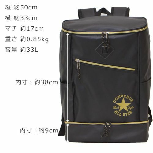 【種類】リュック 通学リュック 高校生 大容量 スクールバッグ 【素材】ポリエステル 【サイズ】外寸:縦約50cm×横約33cm×マチ約17cm 【重さ】約0.85kg 【容量】約33L 【色】ブラック、ブラック/シルバー、ブラック/ゴールド、ネイビー/ピンク 【原産国】ベトナム 【ブランド】CONVERSE(コンバース) メインルーム:オープンポケット 外側:サブルーム、フロントポケット、サイドポケット×2 |