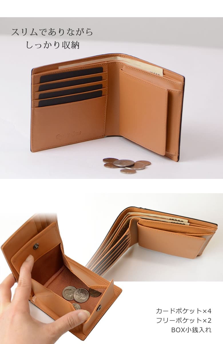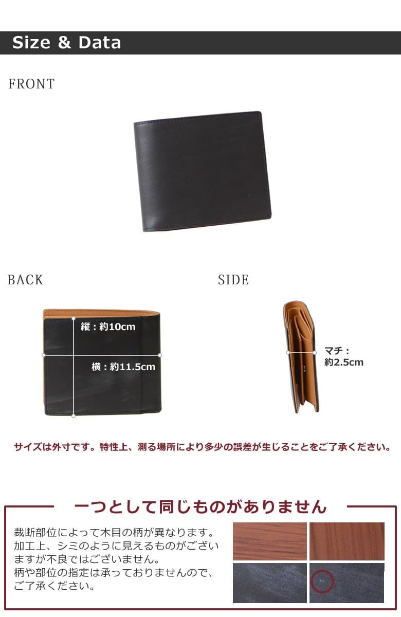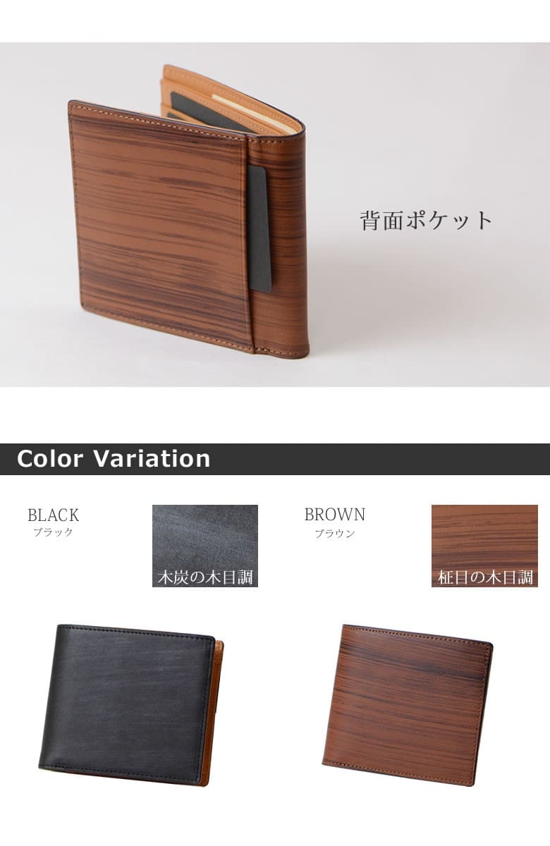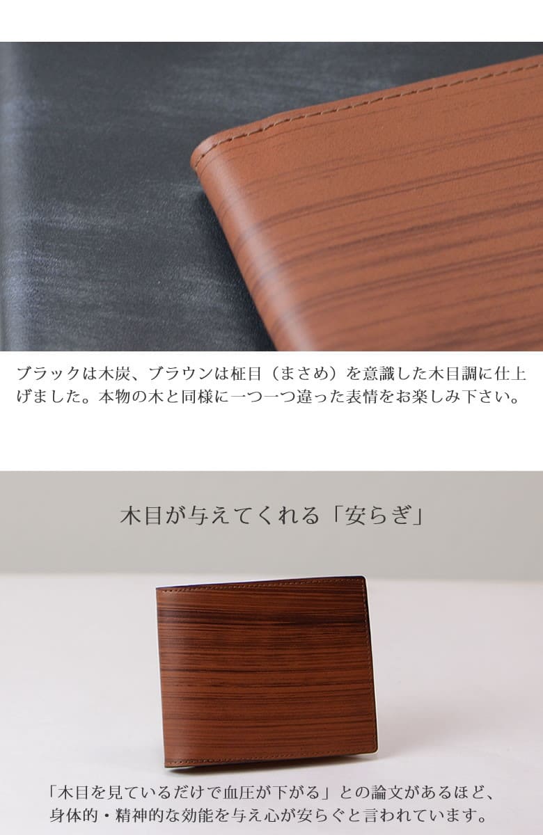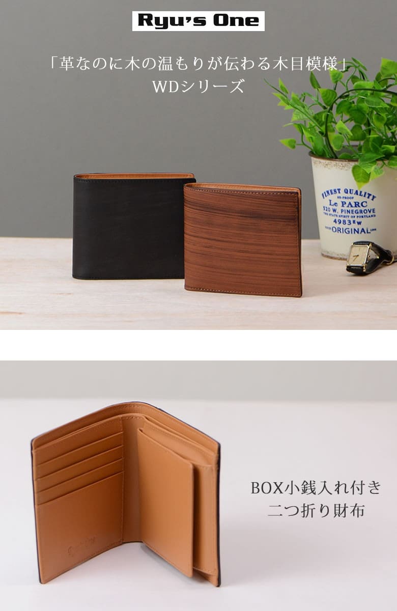 「革なのに木の温もりが伝わる木目模様」ブラックは木炭、ブラウンは柾目(まさめ)を意識した木目調に仕上げたRYU' ONEのWDシリーズ。 本物の木と同様に一つ一つ違った表情をお楽しみ下さい。「木目を見ているだけで血圧が下がる」との論文があるほど、木目は身体的・精神的な効能を与え心が安らぐと言われています。 BOX小銭入れ付き二つ折り財布。スリムでありながら、お札・小銭・カード(4枚)を収しっかり収納。 【素材】牛革(内装一部ナイロン) 【サイズ】外寸:縦約10cm×横約11.5cm×マチ約2.5cm 【重さ】約89g 【色】ブラック、ブラウン |