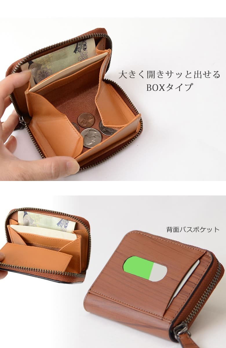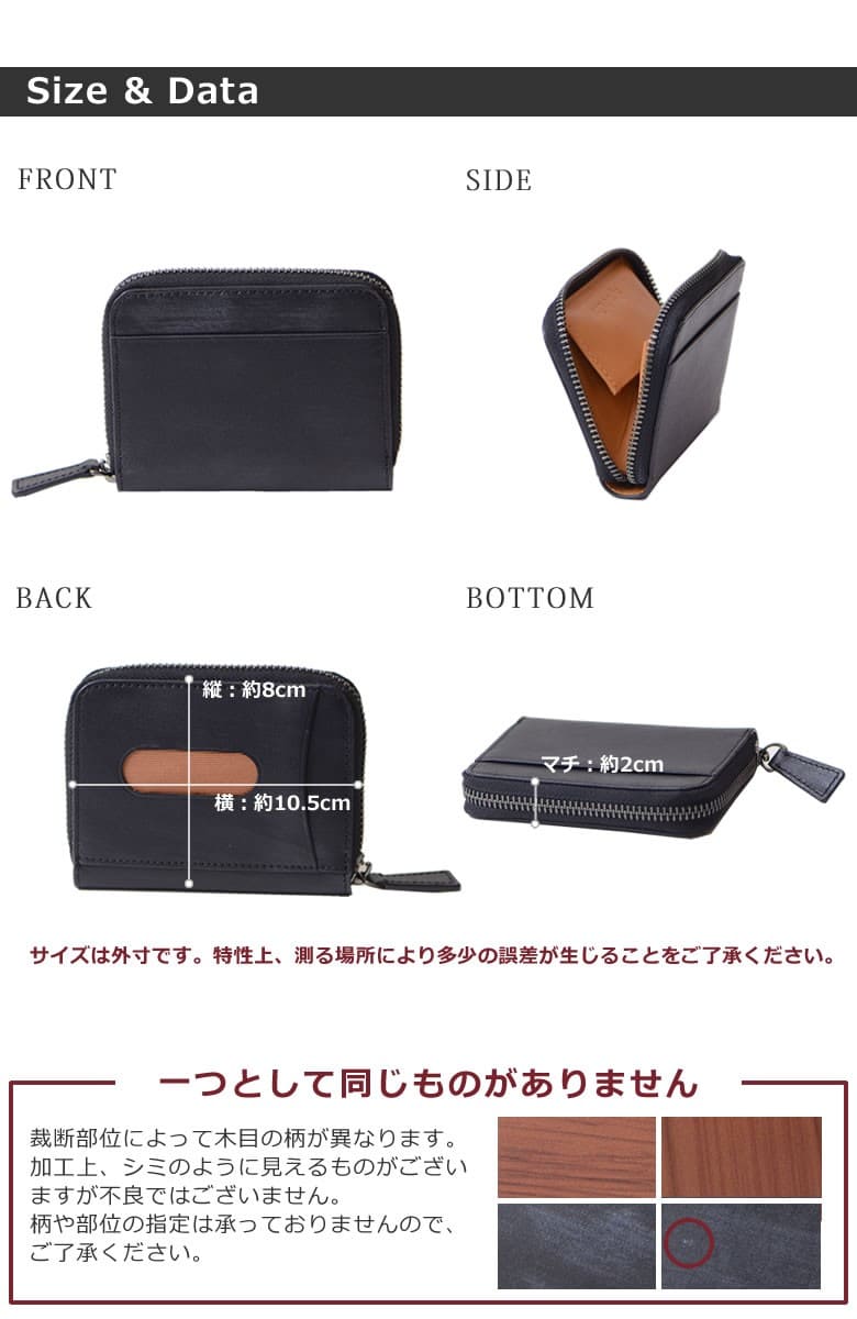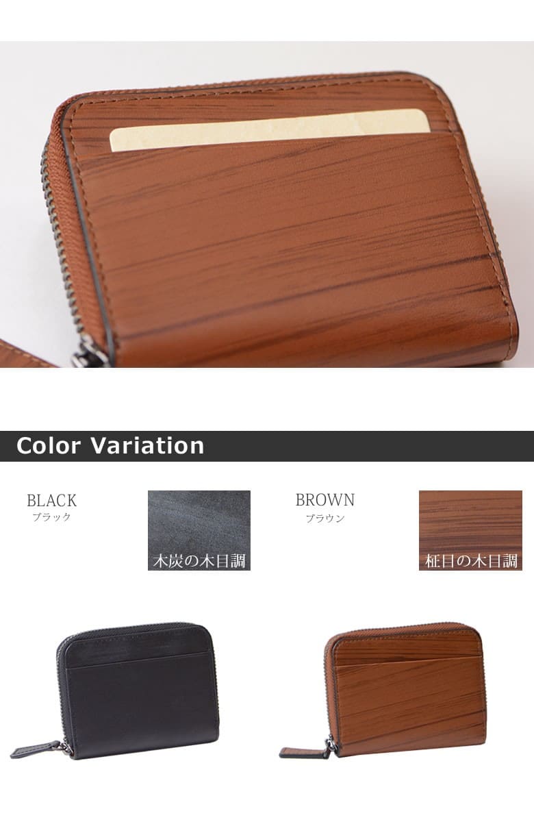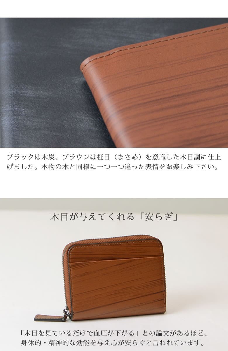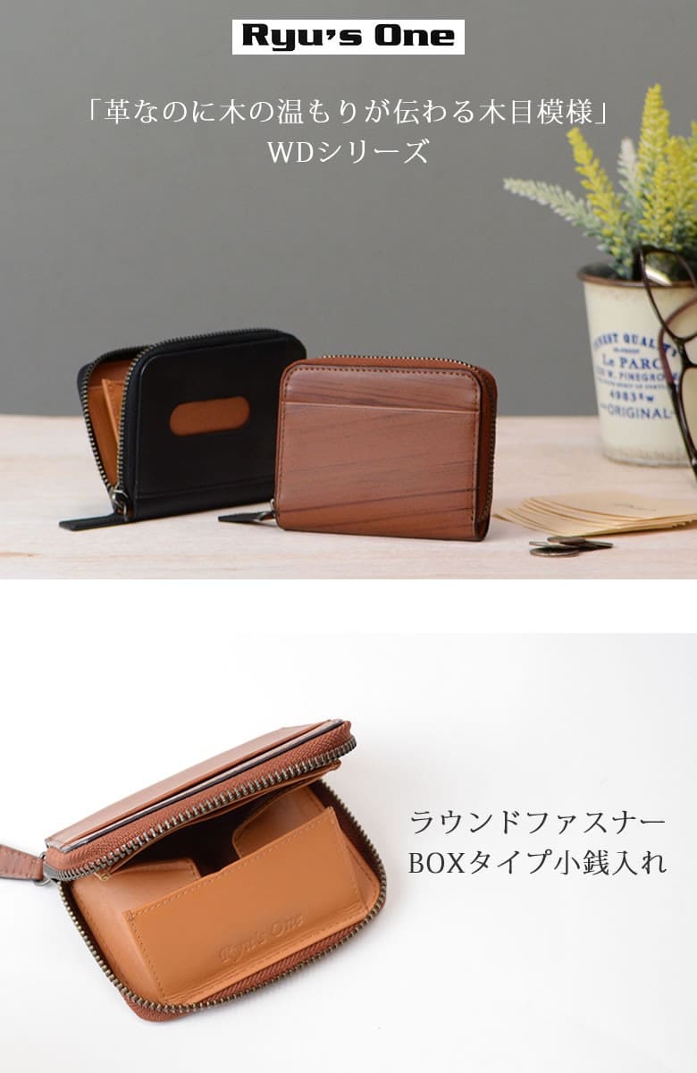 「革なのに木の温もりが伝わる木目模様」ブラックは木炭、ブラウンは柾目(まさめ)を意識した木目調に仕上げたRYU' ONEのWDシリーズ。 本物の木と同様に一つ一つ違った表情をお楽しみ下さい。「木目を見ているだけで血圧が下がる」との論文があるほど、木目は身体的・精神的な効能を与え心が安らぐと言われています。 ラウンドファスナーのBOXタイプ小銭入れ。大きく開いて取り出しやすい小銭スペース。背面は窓付きのパスポケット仕様でICカードの居場所も一目でわかります。 【素材】牛革(内装一部ナイロン) 【サイズ】外寸:縦約8cm×横約10.5cm×マチ約2cm 【重さ】約76g 【色】ブラック、ブラウン |