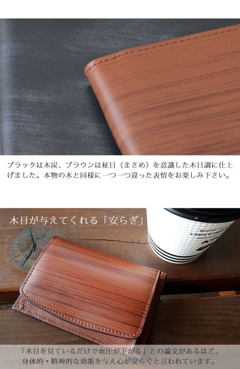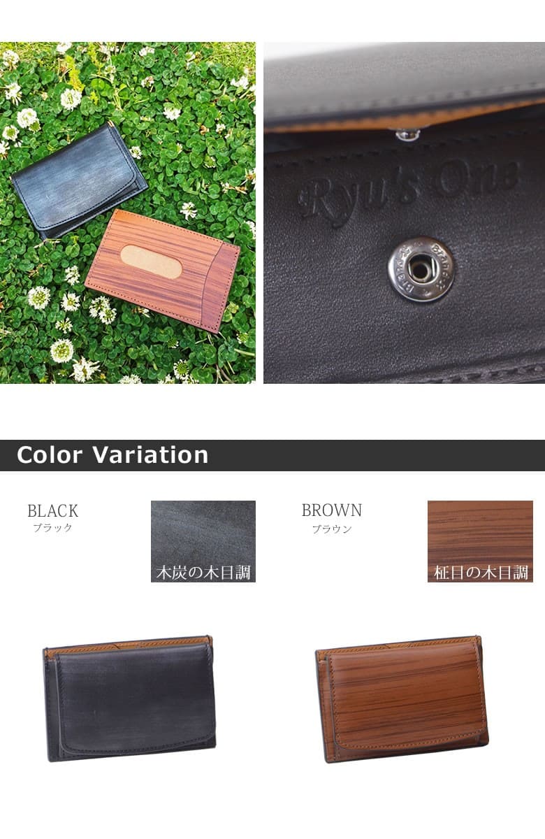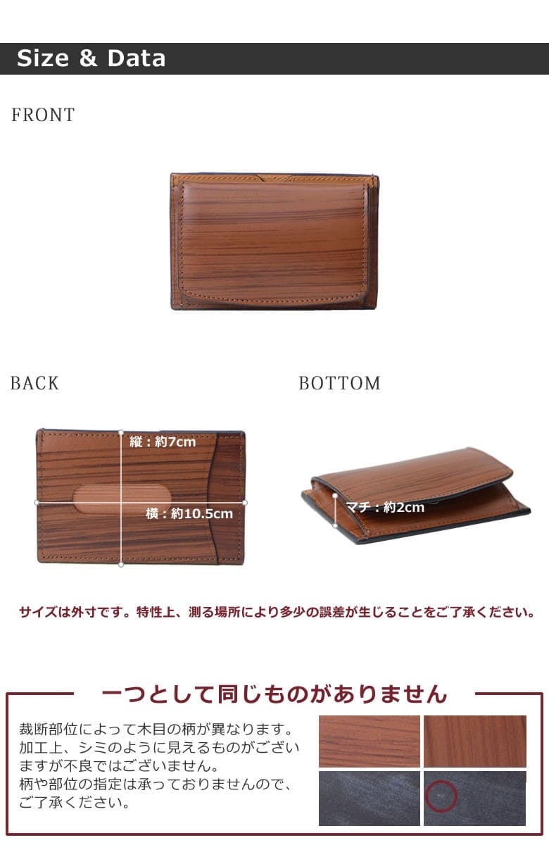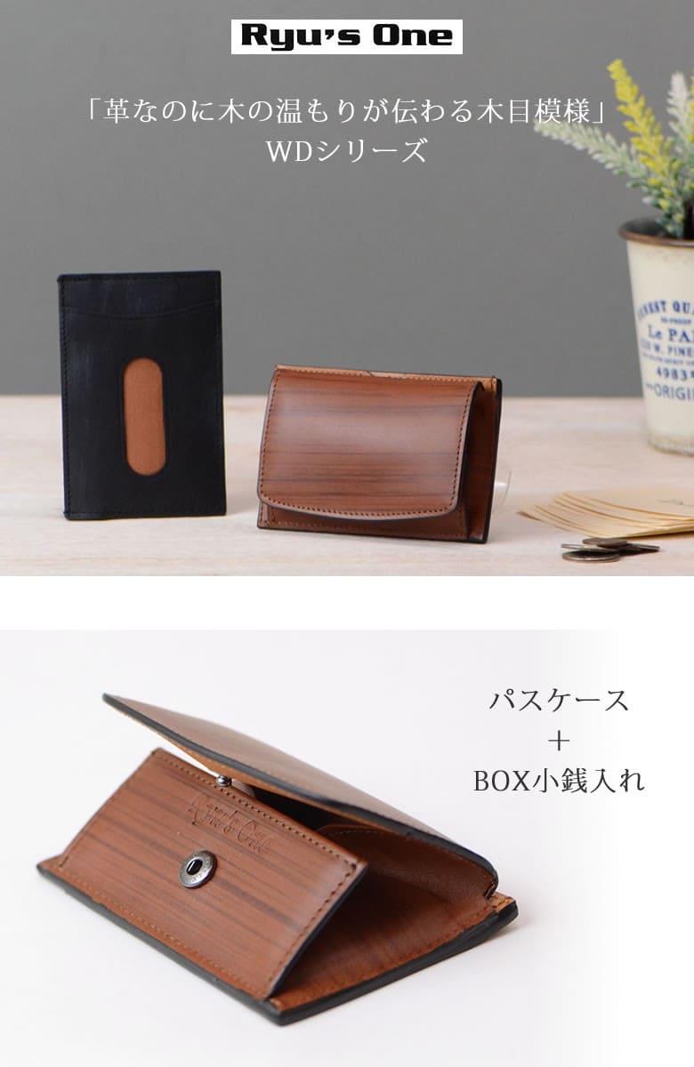 「革なのに木の温もりが伝わる木目模様」ブラックは木炭、ブラウンは柾目(まさめ)を意識した木目調に仕上げたRYU' ONEのWDシリーズ。 本物の木と同様に一つ一つ違った表情をお楽しみ下さい。「木目を見ているだけで血圧が下がる」との論文があるほど、木目は身体的・精神的な効能を与え心が安らぐと言われています。 パスケース+BOX小銭入れのマルチコインケース。大きく開いて取り出しやすい小銭スペース。背面のパスポケットの他に、サイドにもカードポケット×2も装備。 【素材】牛革(内装一部ナイロン) 【サイズ】外寸:縦約7cm×横約10.5cm×マチ約2cm 【重さ】約38g 【色】ブラック、ブラウン |