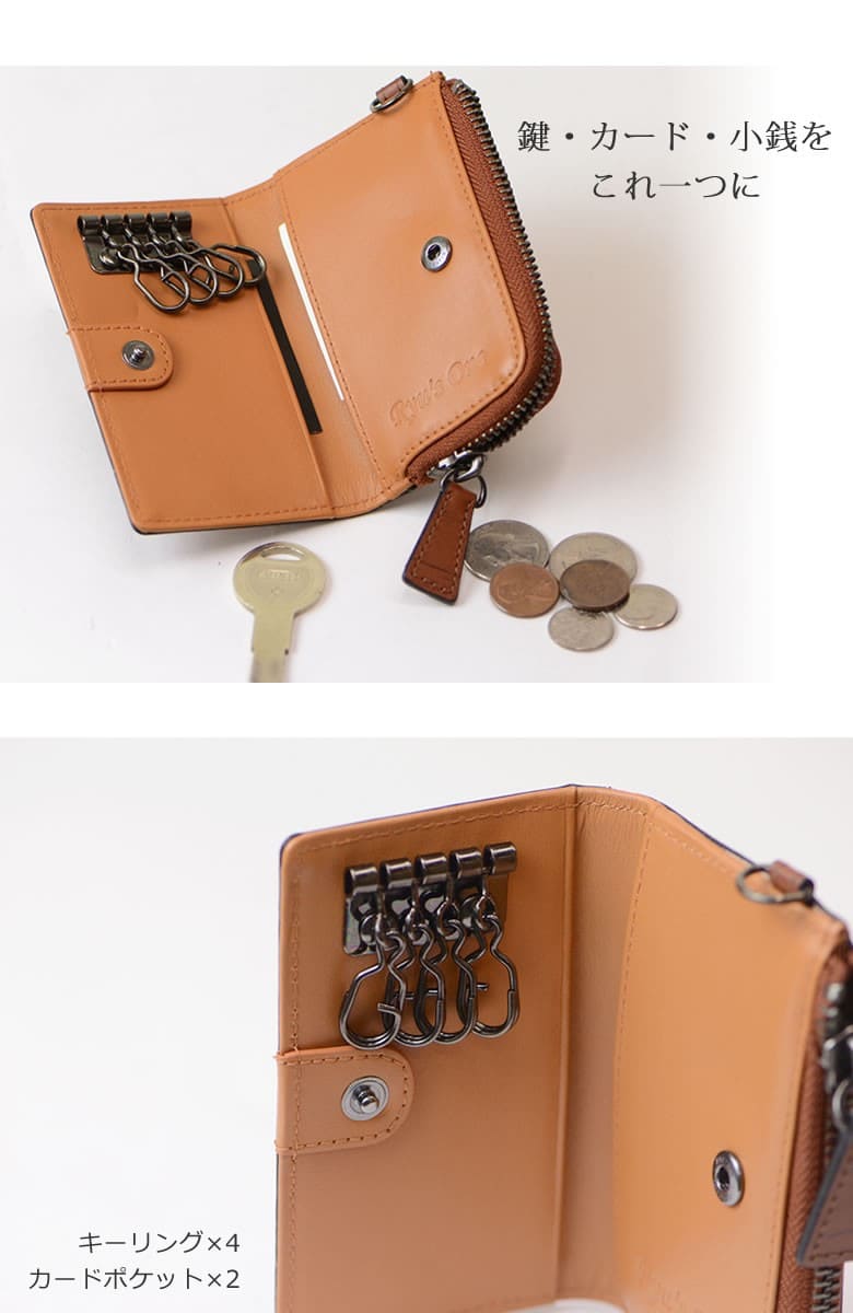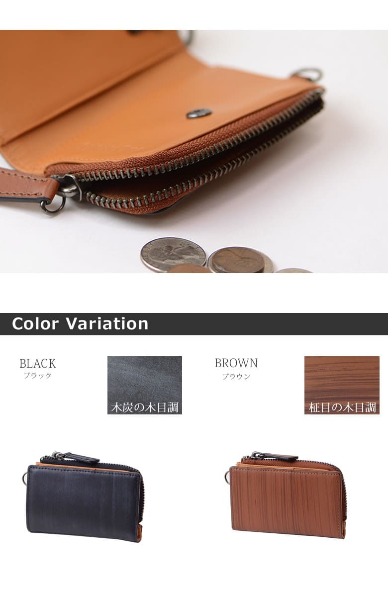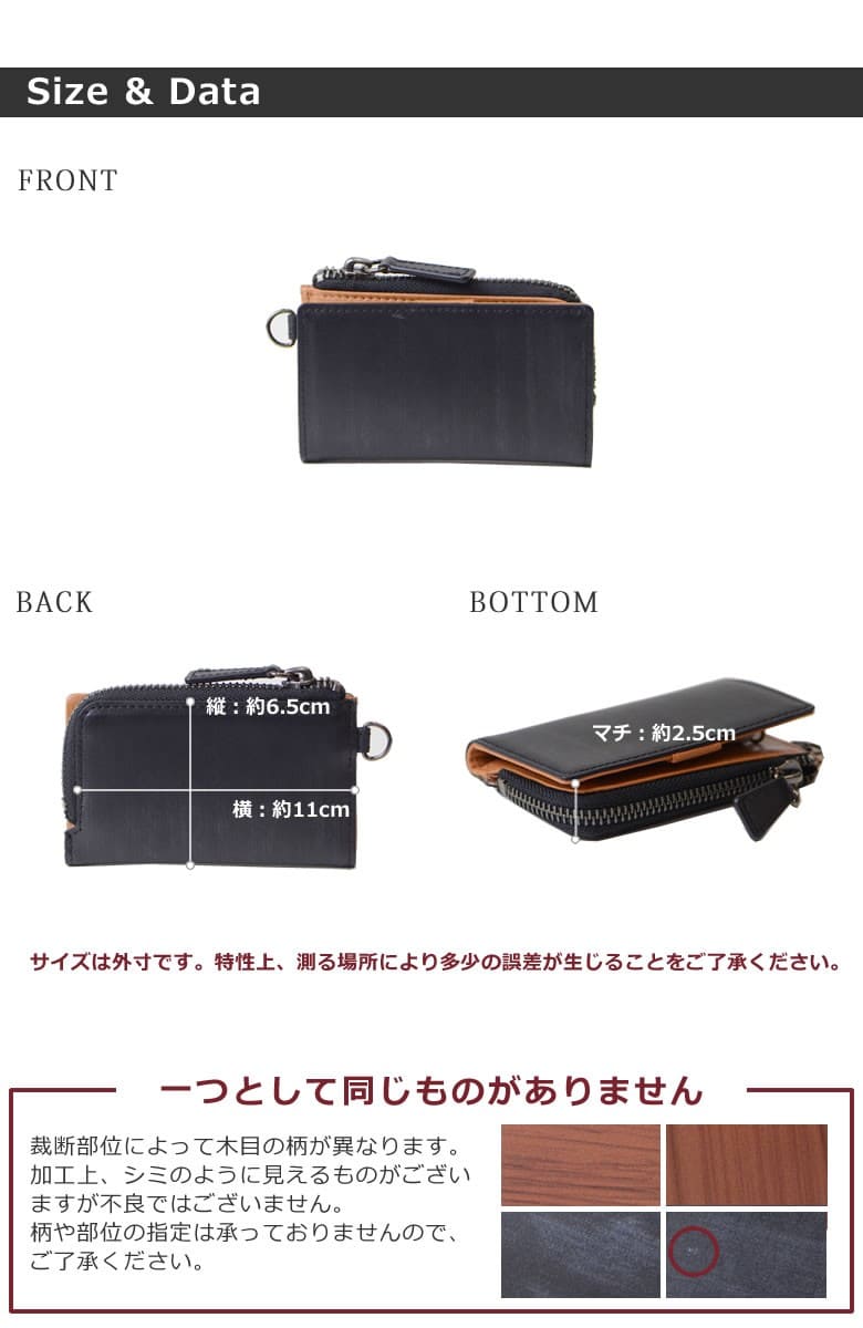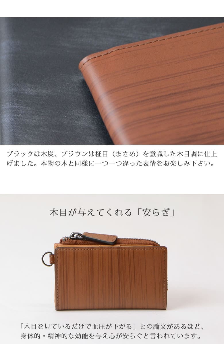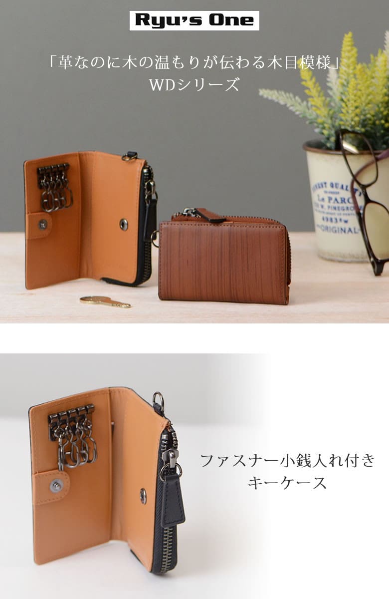 「革なのに木の温もりが伝わる木目模様」ブラックは木炭、ブラウンは柾目(まさめ)を意識した木目調に仕上げたRYU' ONEのWDシリーズ。 本物の木と同様に一つ一つ違った表情をお楽しみ下さい。「木目を見ているだけで血圧が下がる」との論文があるほど、木目は身体的・精神的な効能を与え心が安らぐと言われています。 ファスナー小銭入れ付き二つ折りキーケース。キーリング×4とカードポケット×2を装備し、鍵・カード・小銭を一つに収納できます。Dカンが付属しているので、ウォレットチェーンも付けられます。 【素材】牛革(内装一部ナイロン) 【サイズ】外寸:縦約6.5m×横約11cm×マチ約2.5cm 【重さ】約68g 【色】ブラック、ブラウン |