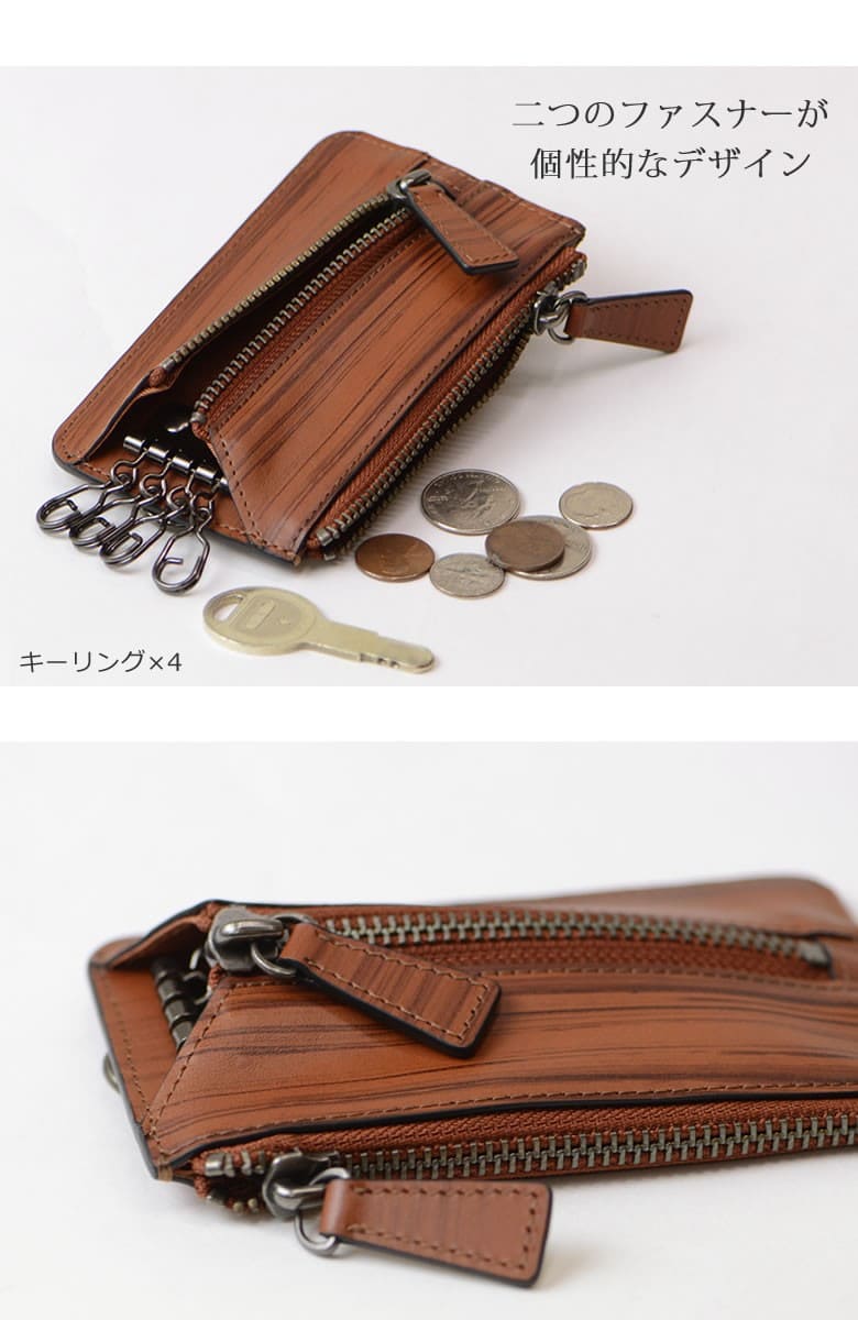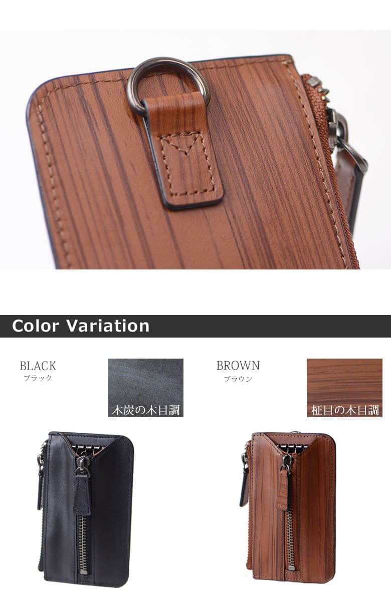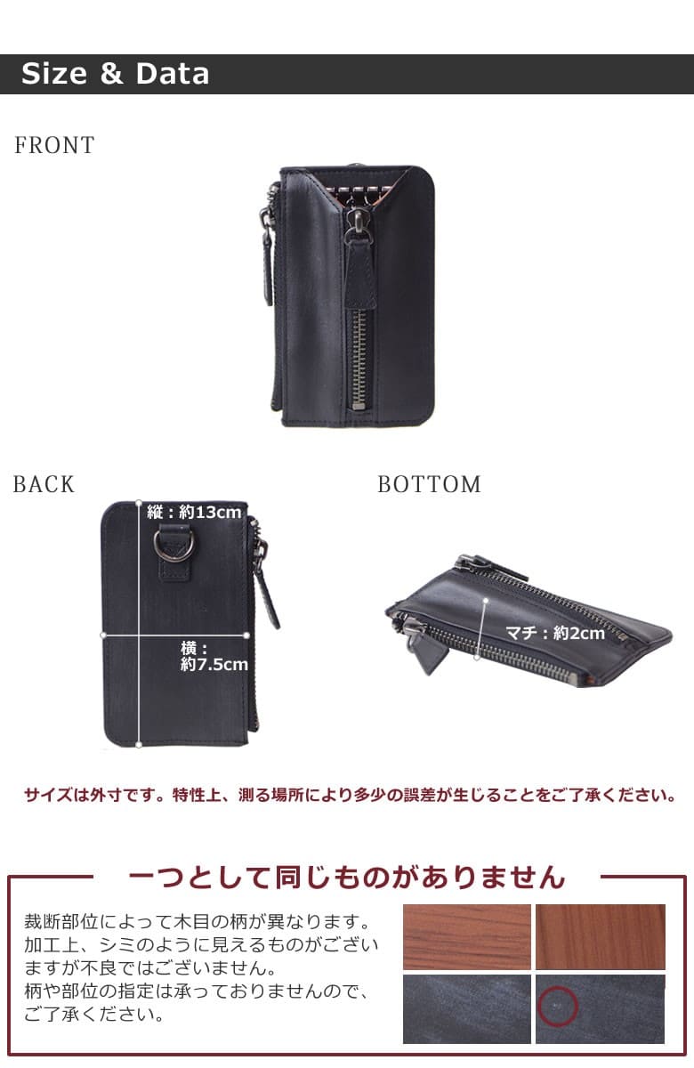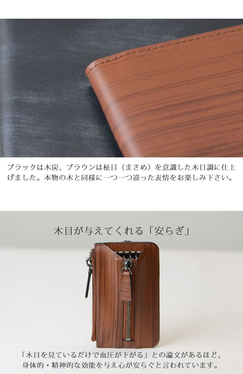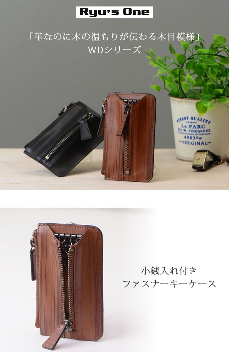 「革なのに木の温もりが伝わる木目模様」ブラックは木炭、ブラウンは柾目(まさめ)を意識した木目調に仕上げたRYU' ONEのWDシリーズ。 本物の木と同様に一つ一つ違った表情をお楽しみ下さい。「木目を見ているだけで血圧が下がる」との論文があるほど、木目は身体的・精神的な効能を与え心が安らぐと言われています。 小銭入れ付きファスナー仕様のキーケース。鍵と小銭を一緒に持ち歩き。中央のファスナーをアクセントに個性的なデザインに仕上がっています。Dカンが付属しているので、ウォレットチェーンも付けられます。 【素材】牛革(内装一部ナイロン) 【サイズ】外寸:縦約13cm×横約7.5cm×マチ約2cm 【重さ】約70g 【色】ブラック、ブラウン |