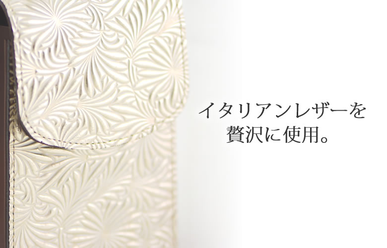 ARUKANのNeutralgray(ニュートラルグレイ)と目々澤鞄がコラボレーション。上品なシャンパンゴールドの輝きが女性の美しさを引き立てます。付属のブラウンカラーとのコントラストがラグジュアリー。日本製の品質の良さとデザインが魅力。