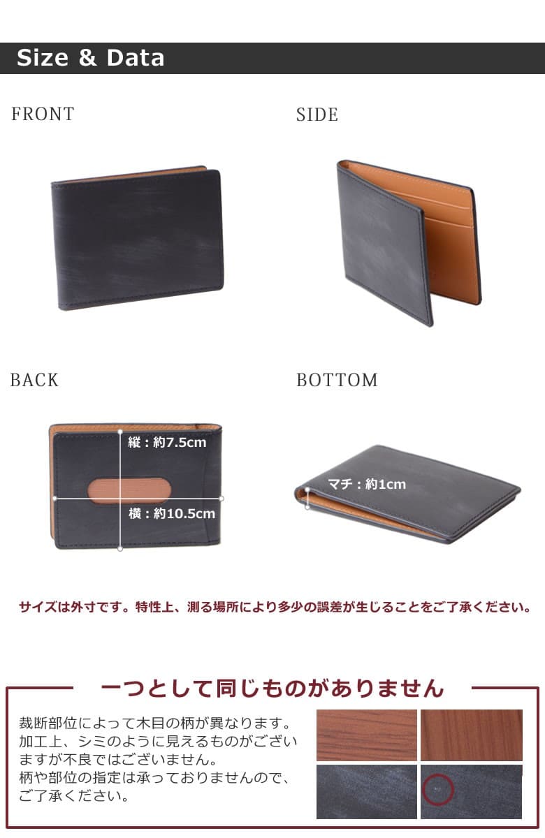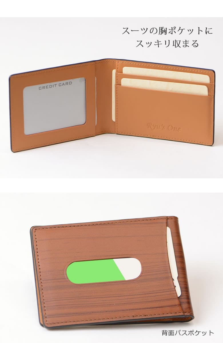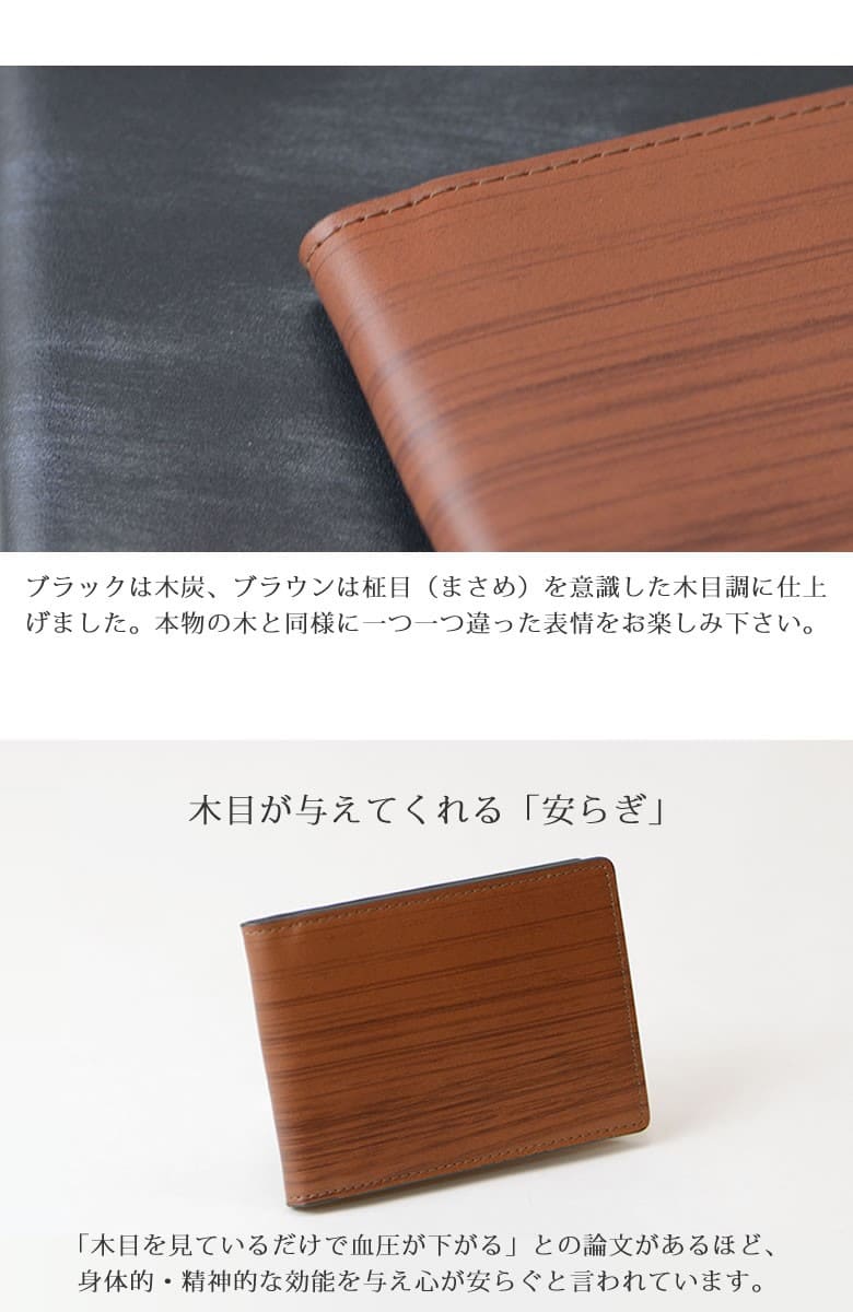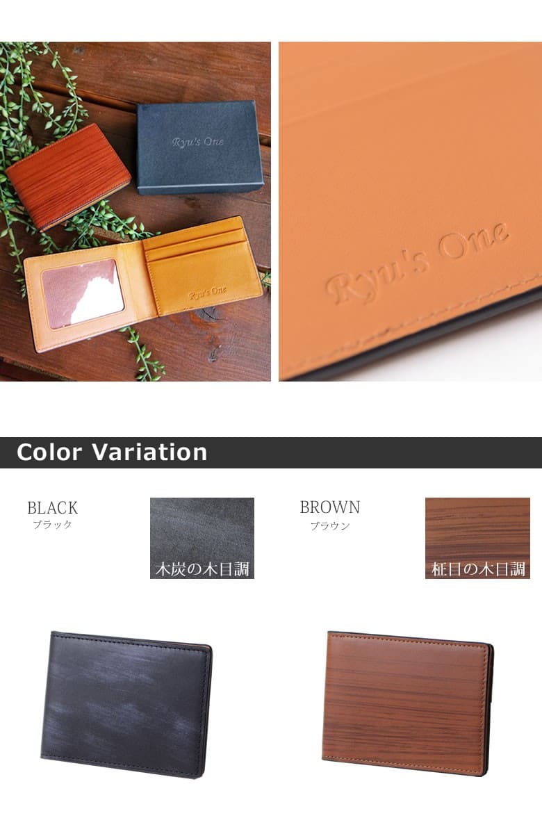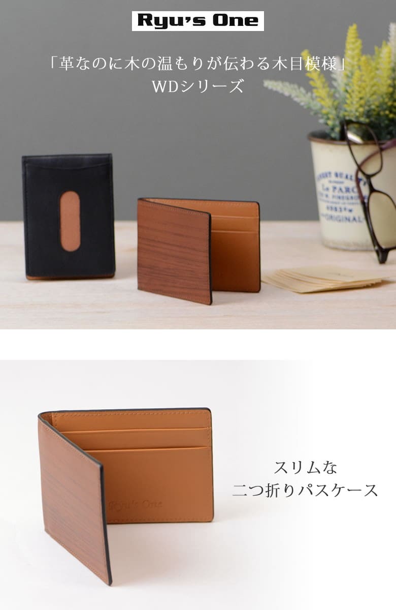 「革なのに木の温もりが伝わる木目模様」ブラックは木炭、ブラウンは柾目(まさめ)を意識した木目調に仕上げたRYU' ONEのWDシリーズ。 本物の木と同様に一つ一つ違った表情をお楽しみ下さい。「木目を見ているだけで血圧が下がる」との論文があるほど、木目は身体的・精神的な効能を与え心が安らぐと言われています。 スリムな二つ折りパスケース。スーツの胸ポケットにスッキリ収まる薄マチタイプ。窓付きポケット×2の他にカードポケット×3も装備。 【素材】牛革(内装一部ナイロン) 【サイズ】外寸:縦約7.5cm×横約10.5cm×マチ約1cm 【重さ】約38g 【色】ブラック、ブラウン |